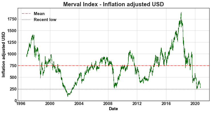 I wonder if the brave person who bought after the 2001 default is expecting more chaos this year or already feels confident to buy. The MERVAL index could drop an additional 66% and reach the 2002 low adjusted for inflation, or could have already hit a low after dropping 86.6% from the 2018 high.